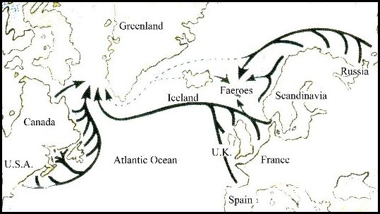 The natural range of Atlantic salmon includes the sub arctic North Atlantic Ocean basin and rim. Its oceanic feeding range includes waters surrounding southern Greenland and Iceland. Its freshwater habitats, both for spawning and rearing, extend as far south as Spain on the Bay of Biscay in the east and to the Gulf of Maine in the west. Atlantic salmon are world travelers. Salmon from Western Europe, Canada and the U.S. will migrate to their normal feeding grounds near southwestern Greenland. One fish originally tagged in New Brunswick, Canada was captured and released near Norway and again in a New Brunswick river.