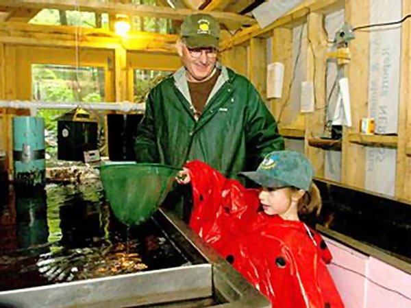 ![]() Madison, our littlest fish stocker gives it a try by scooping a net full of Atlantic salmon fry. (2) |