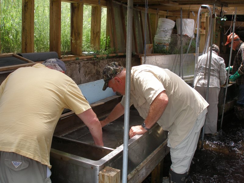 ![]() Members Dick Kirby, Jim Lawler, Martha Paye and Ted Collings cleaning out the tanks in the hatchery for the summer. |